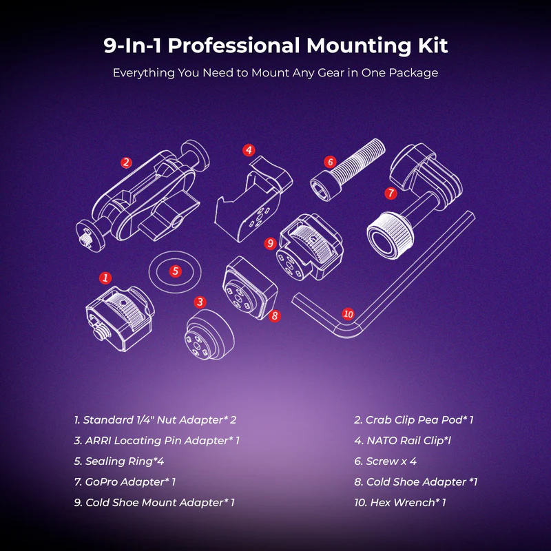 • All-In-One Adapter Kit: Includes Standard 1/4 Nut, ARRI Locating Pin, GoPro Adapter, Cold Shoe Adapter & NATO Rail Clip.