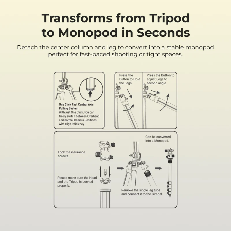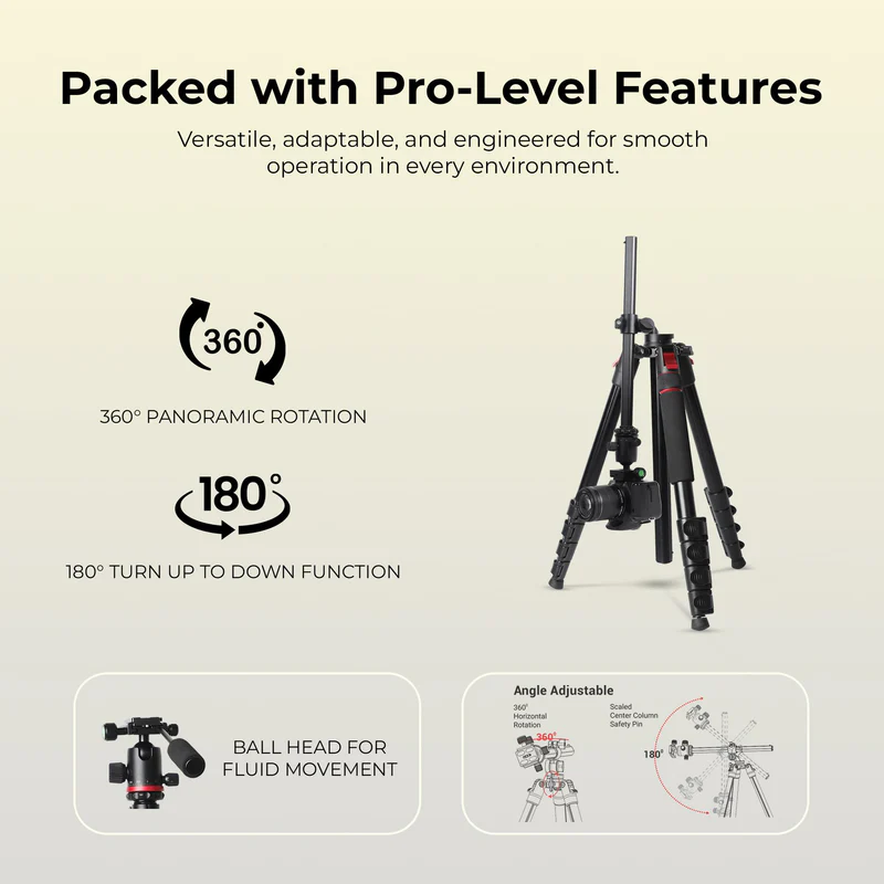 - 2-in-1 Tripod cum Monopod Design – Effortlessly switch between tripod and monopod mode to suit your shooting needs—perfect for both photography and videography on the go.